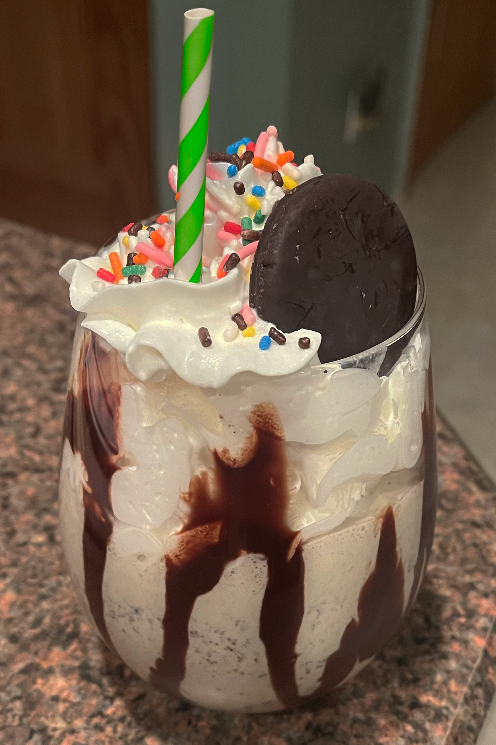 - Drizzle chocolate syrup on the inside of your desired milkshake cup