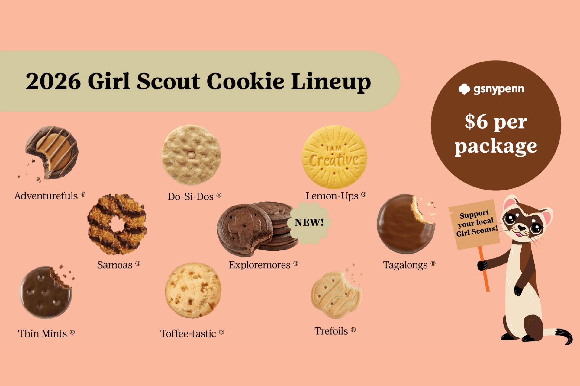 Our local lineup includes classics like Thin Mints®, Samoas®, Tagalongs® and more — plus NEW Exploremores® — all priced at $6 per package.