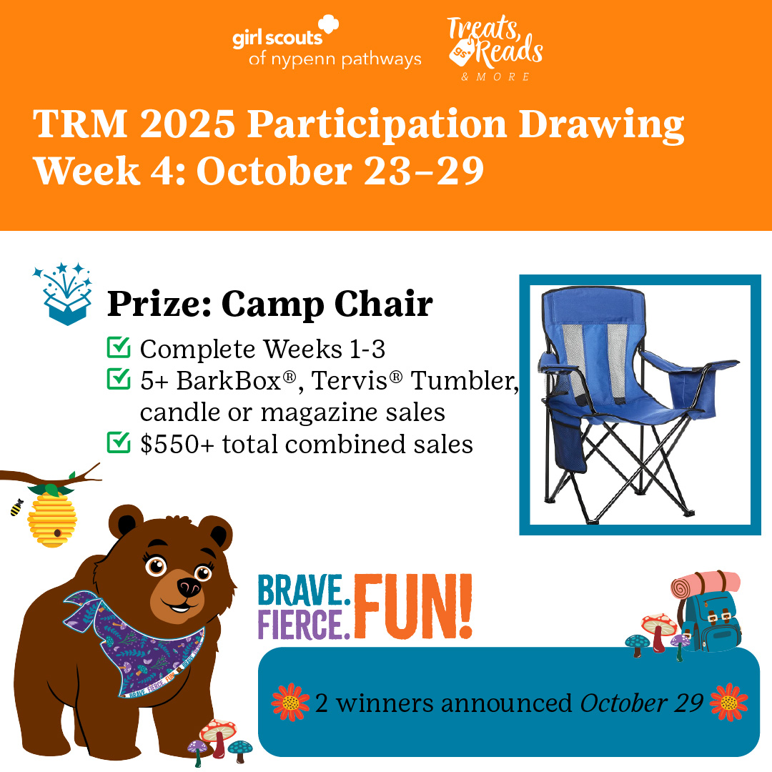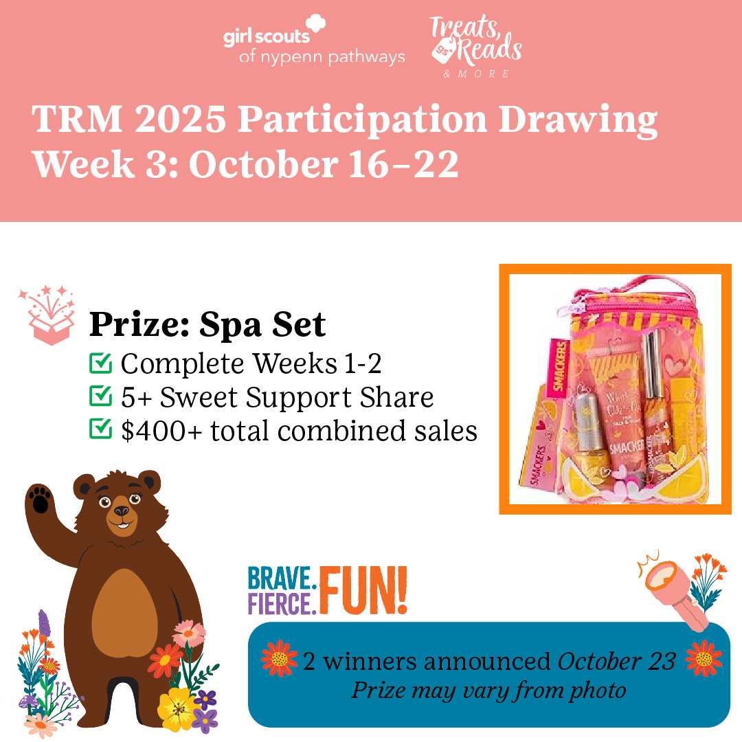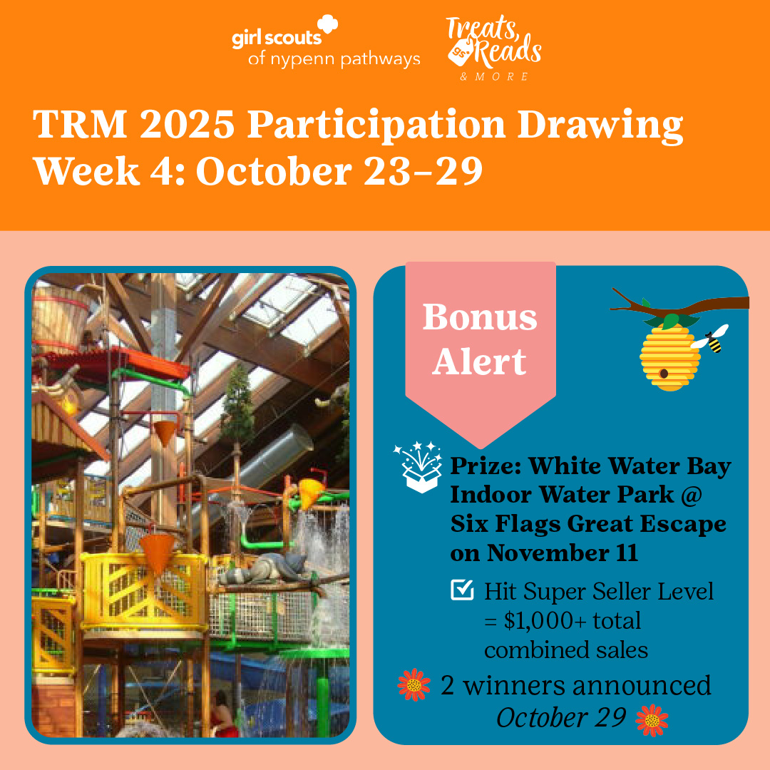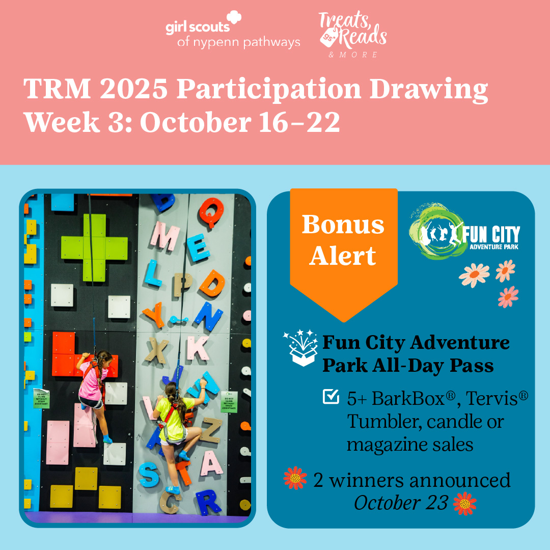 Check out our weekly incentives and special bonus alerts to keep GSNYPENN Girl Scouts engaged during TRM. Here's what you could win just by actively participating in the program. Keep an eye out for related posts on our council social channels. Good luck!